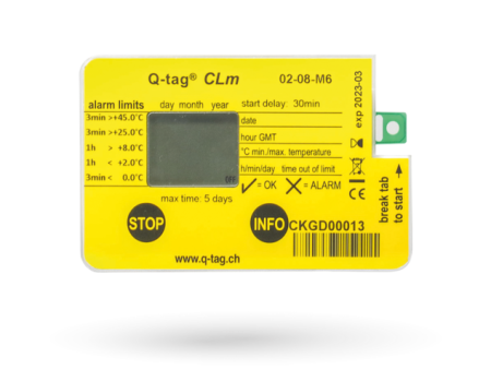 Q-tag Clm là một thiết bị theo dõi nhiệt độ được lập trình với 5 giới hạn cảnh báo riêng từ -25°C đến +50°C. Nhờ có miếng bẻ khởi động, nó giúp bạn biết khi nào thiết bị thực sự khởi động. Giúp bạn đưa ra những quyết định nhanh chóng và dễ dàng vì có thông tin ngày và giờ chính xác trên màn hình của thiết bị. Với tuổi thọ lâu dài lên đến 5 năm, Q-tag CLm là thiết bị lý tưởng để theo dõi toàn bộ dây chuyền lạnh.